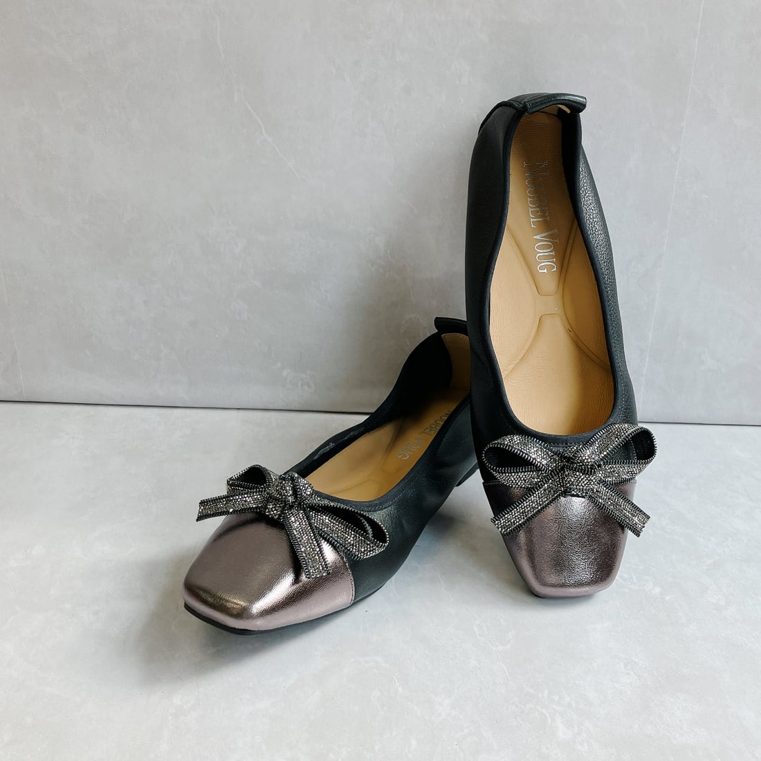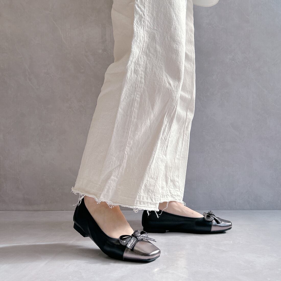 トレンドの大きめリボンにラインストーンを散りばめ、つま先部分のメタリック素材がエレガントでフェミニンな印象のパンプス。