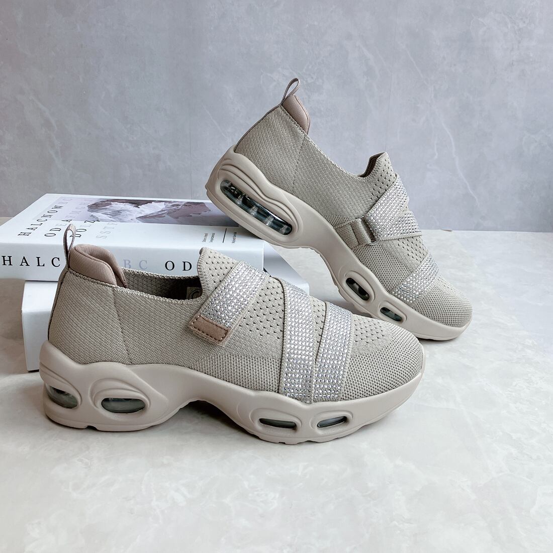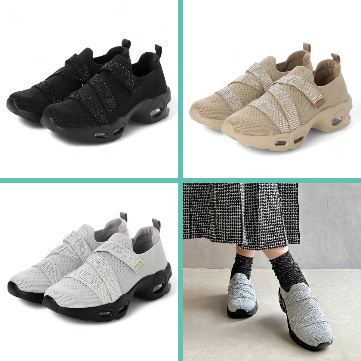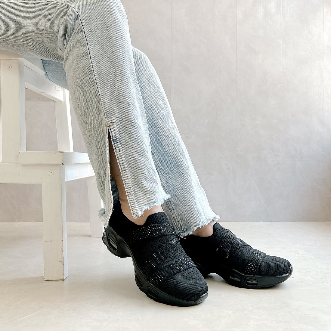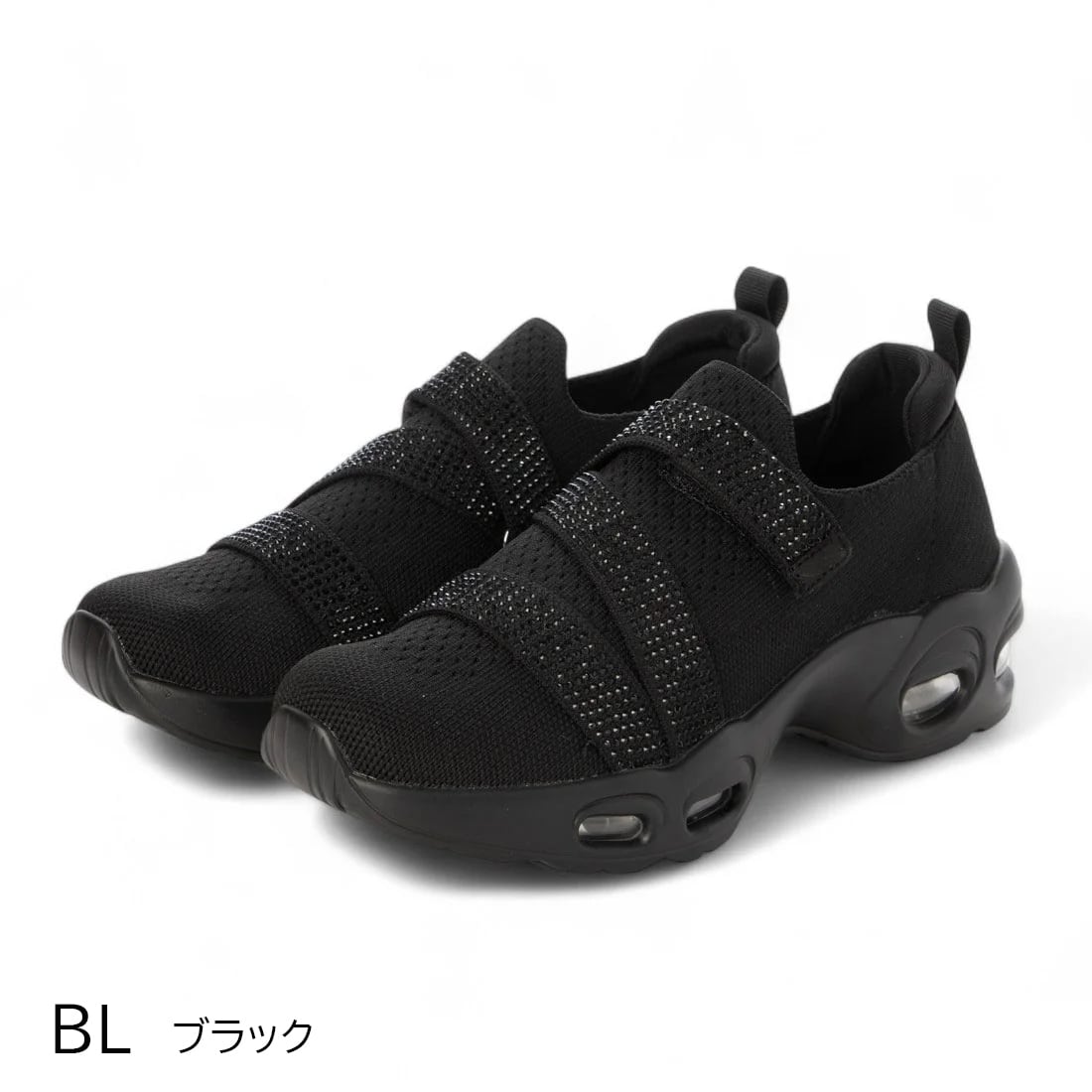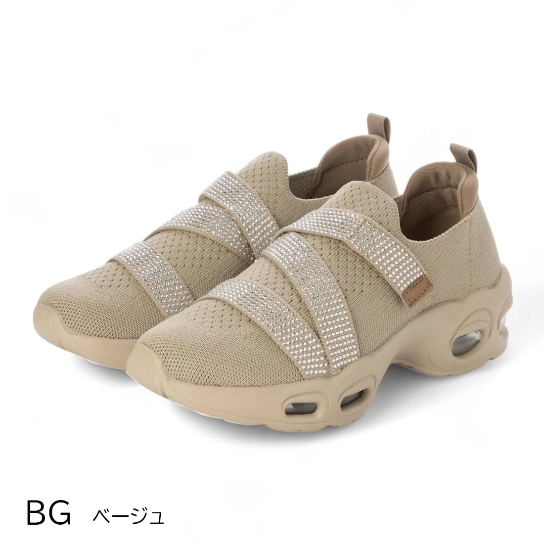 柔らかいニット素材にラインストーンのベルトをあしらった、華やかで上品、楽ちんなスニーカーです。