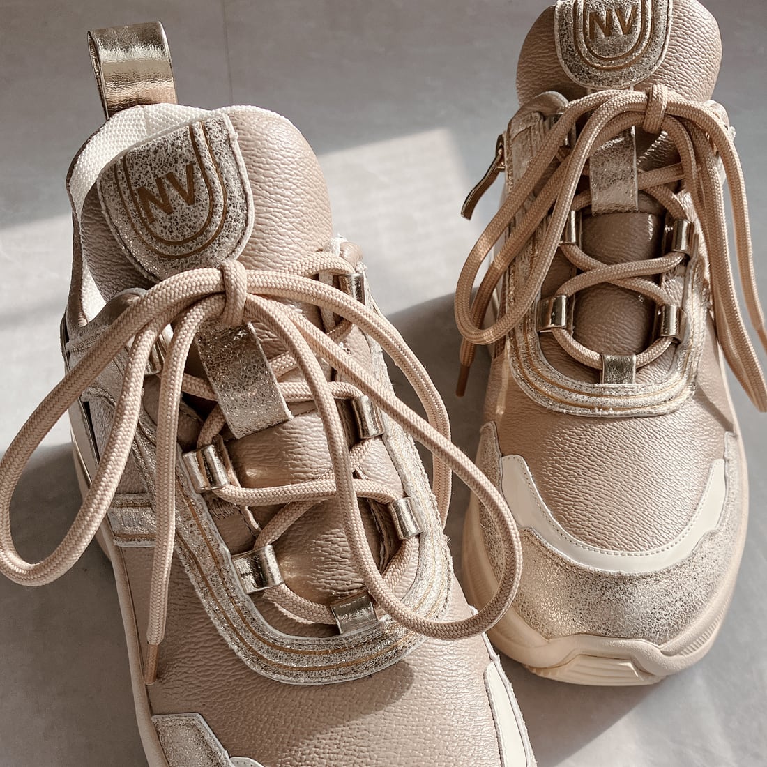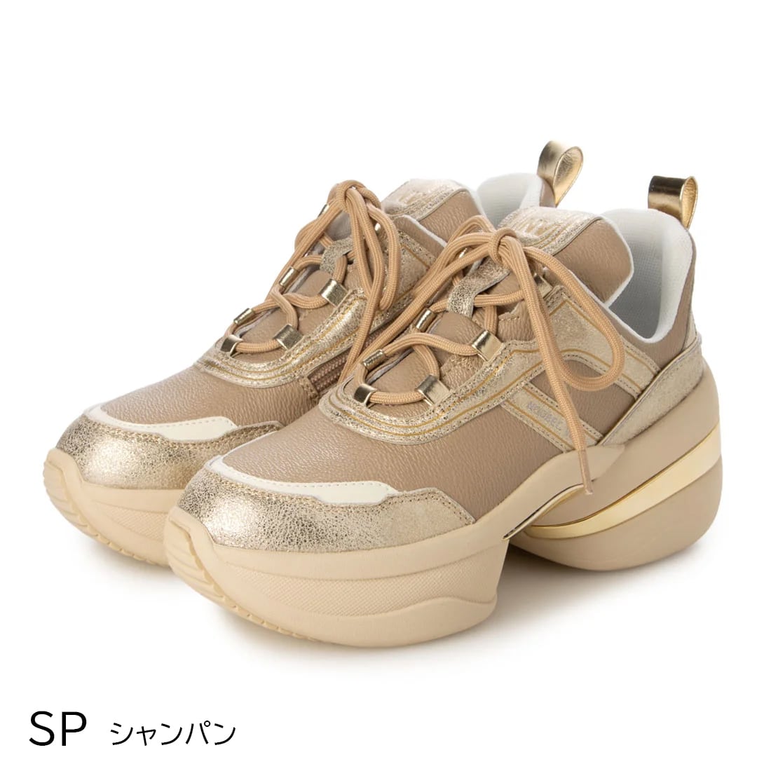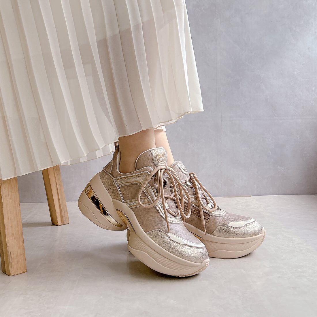異素材を組み合わせたアッパーと、さりげなく輝くメタリックパーツが、