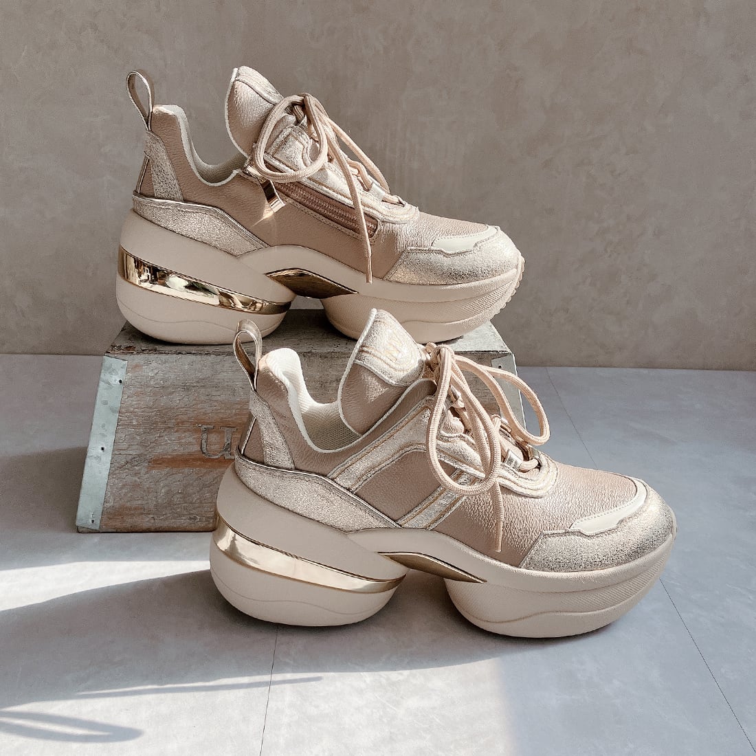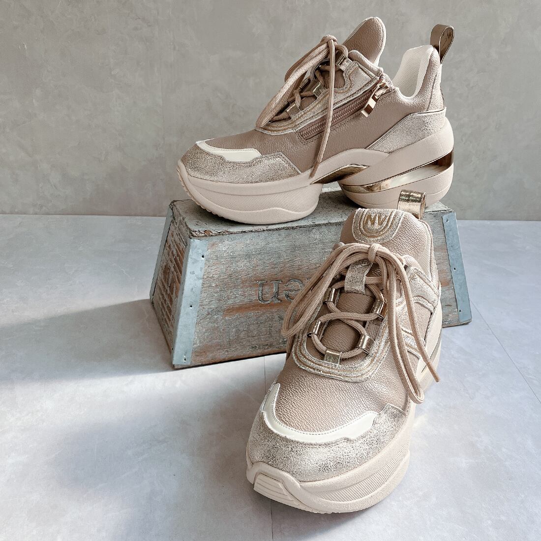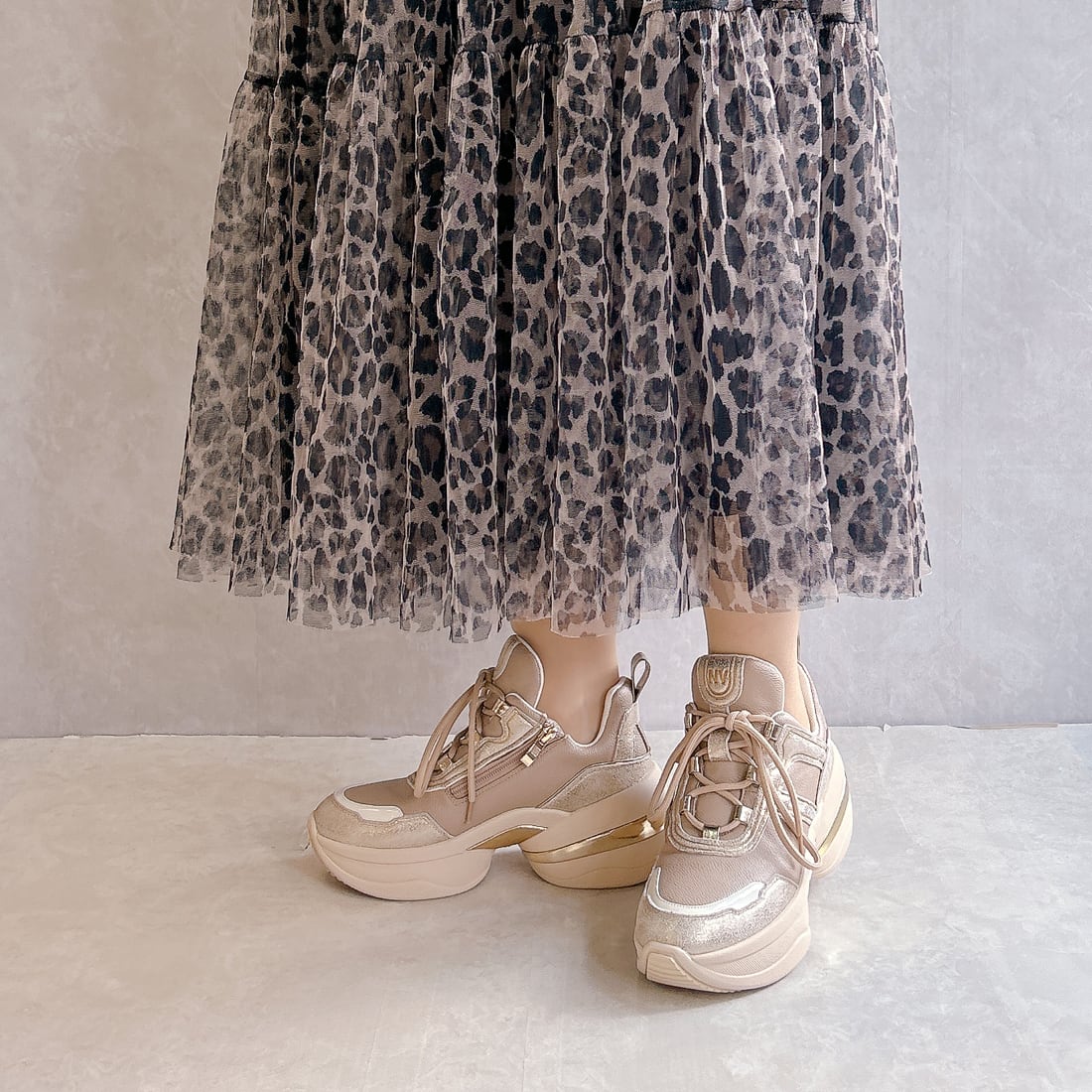 異素材を組み合わせたアッパーと、さりげなく輝くメタリックパーツが、