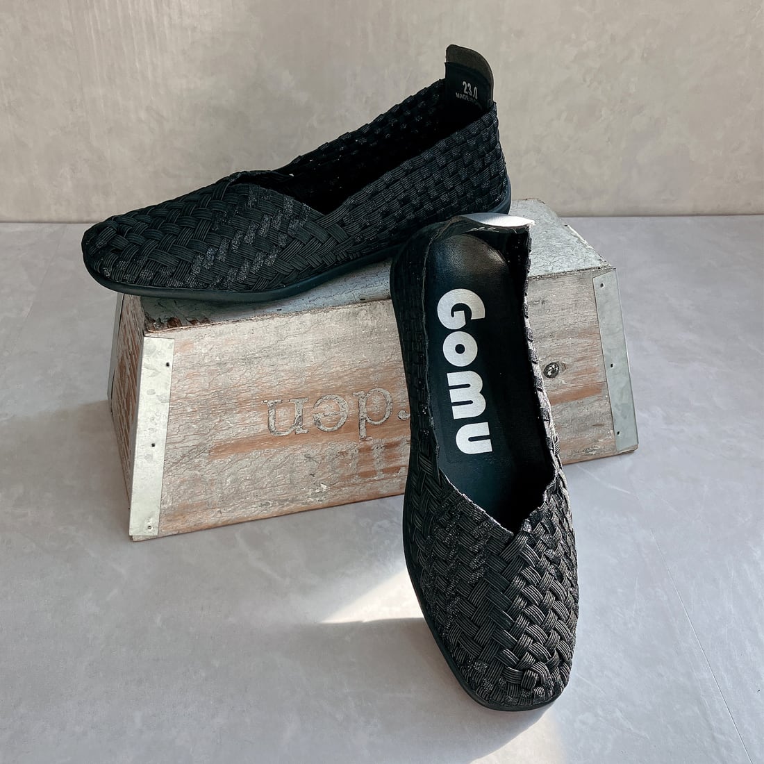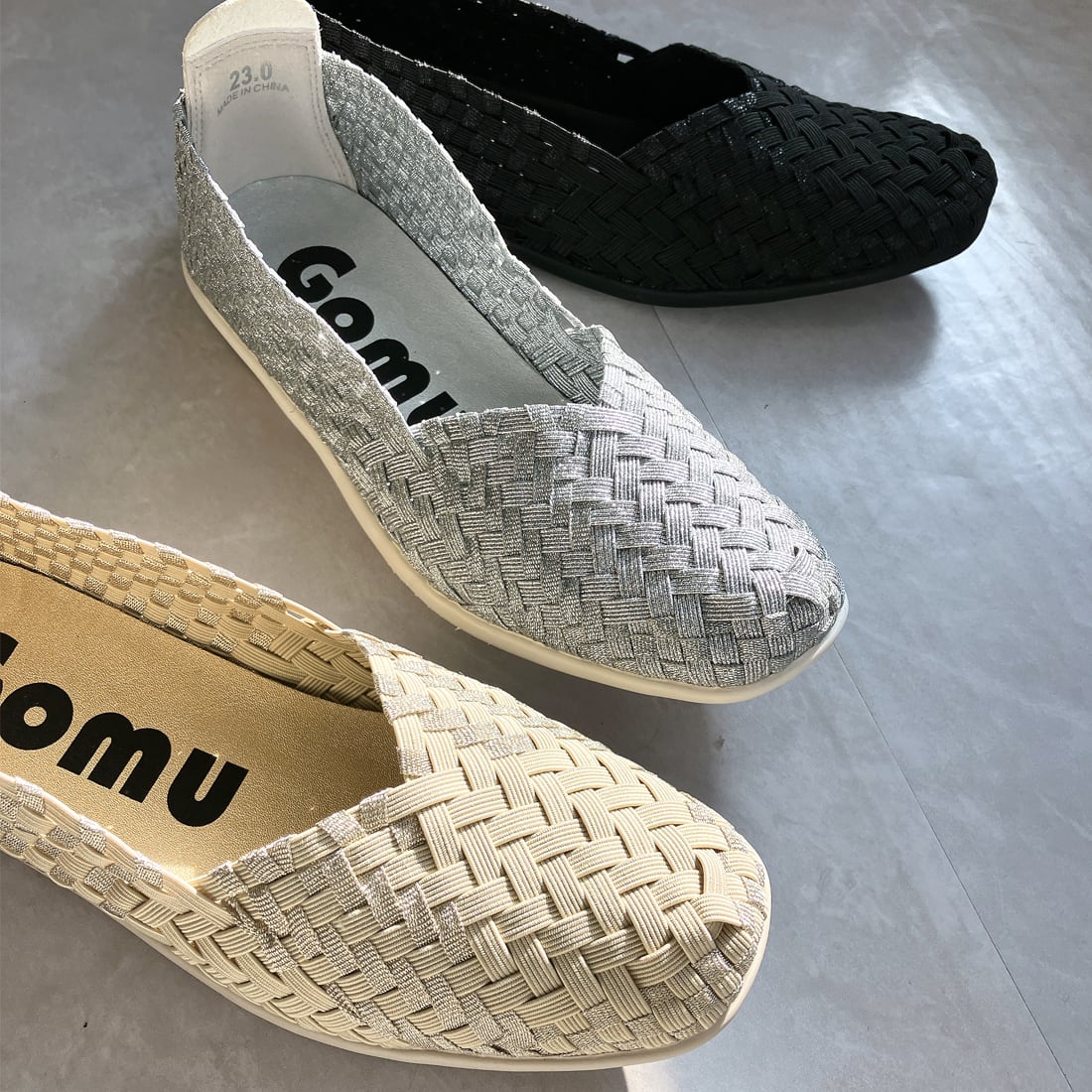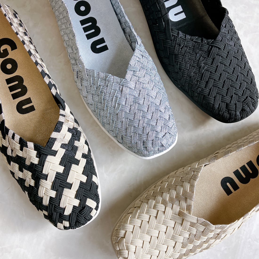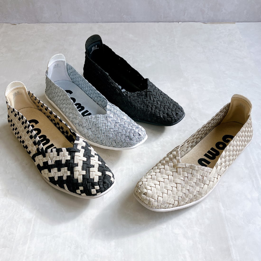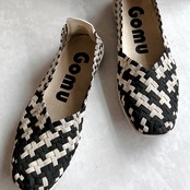 人気ブランド「ゴムゴム」の編み込みメッシュのやわらかバレエシューズ。