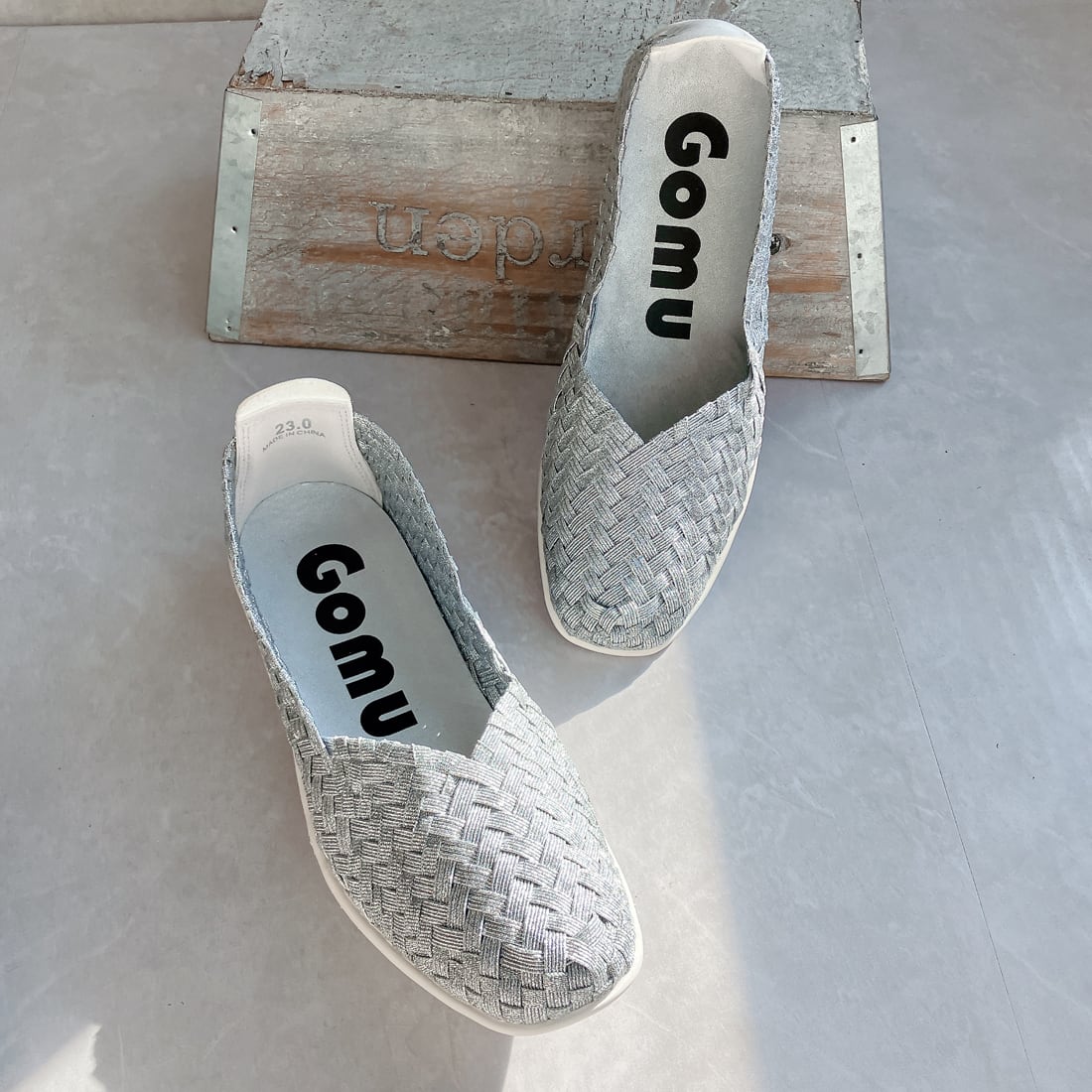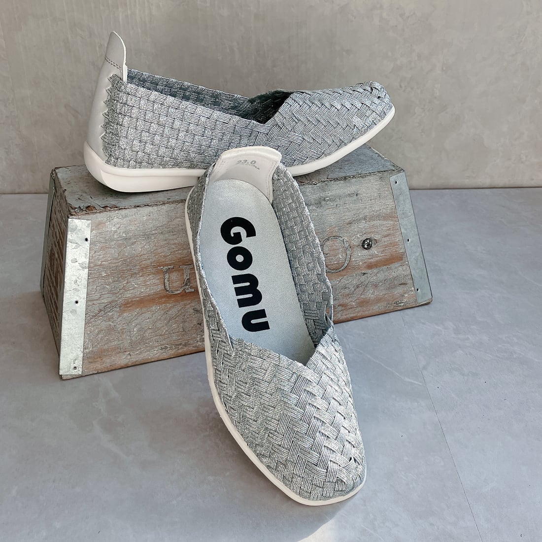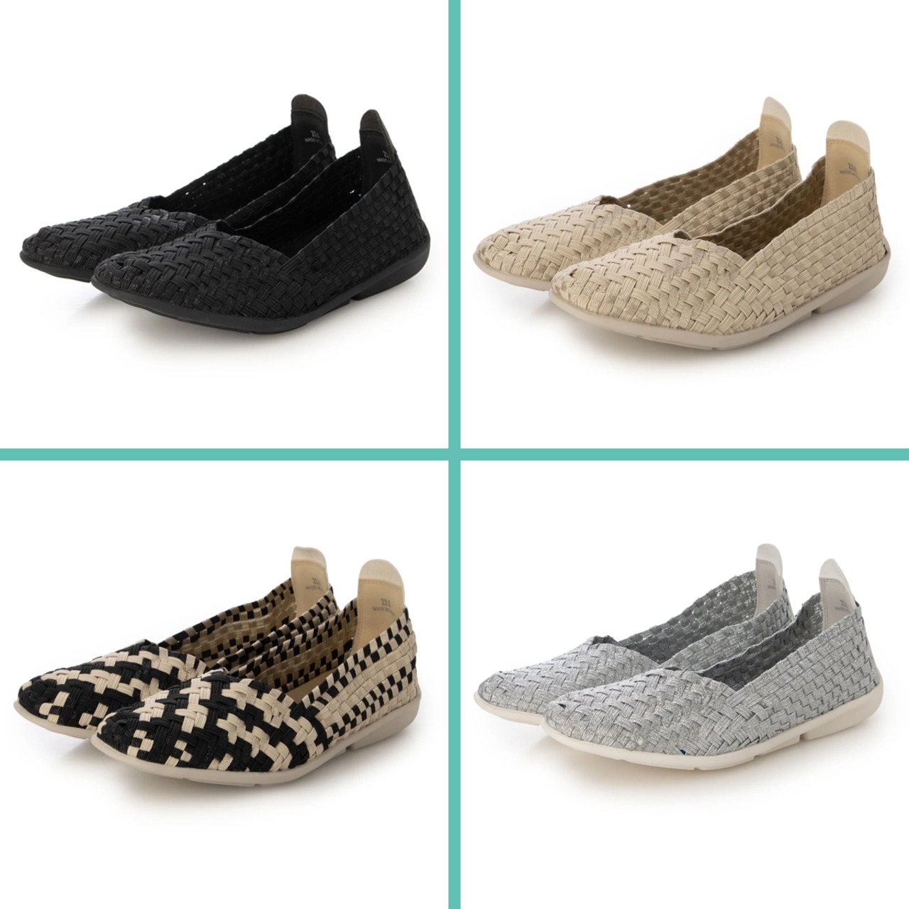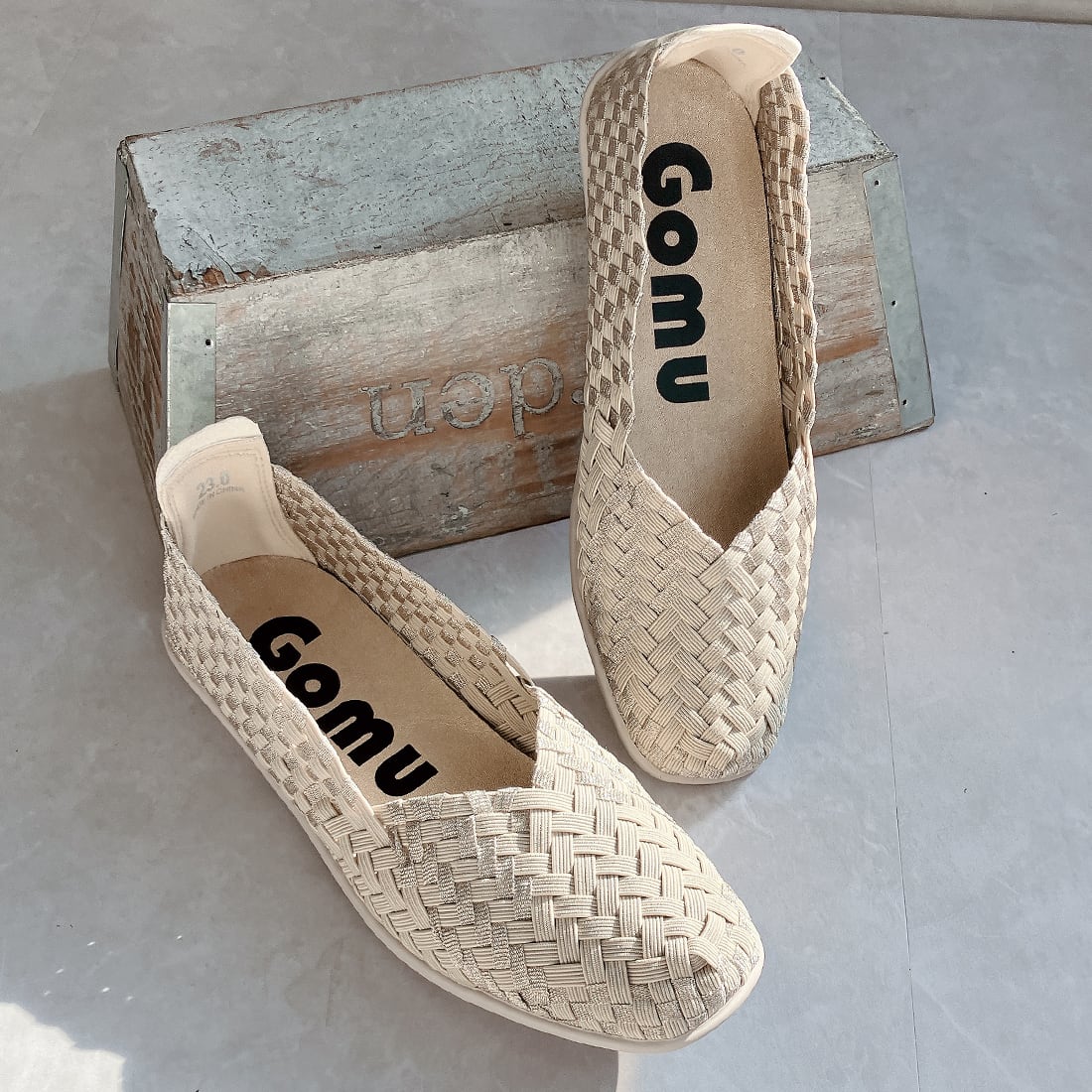 人気ブランド「ゴムゴム」の編み込みメッシュのやわらかバレエシューズ。