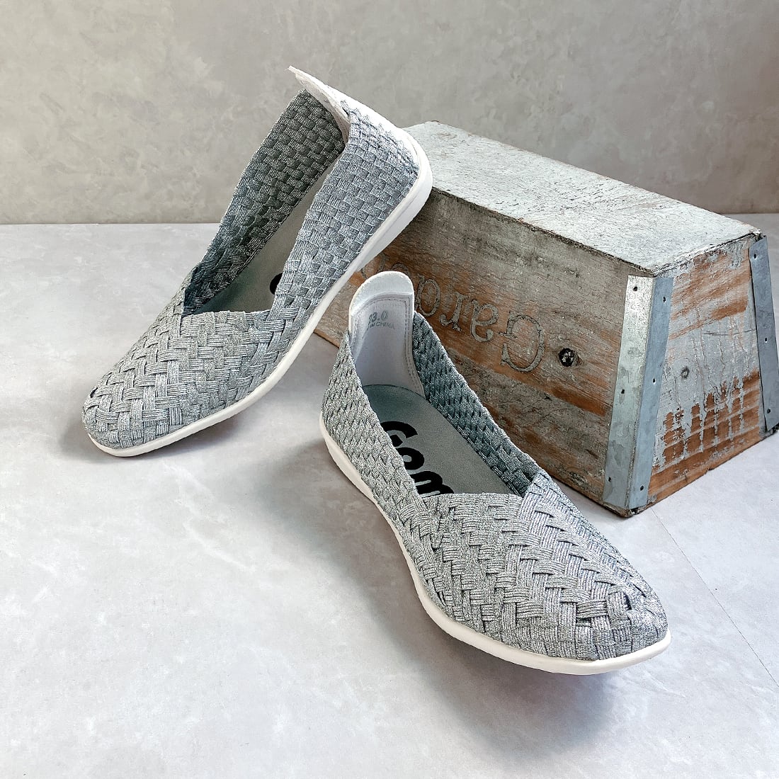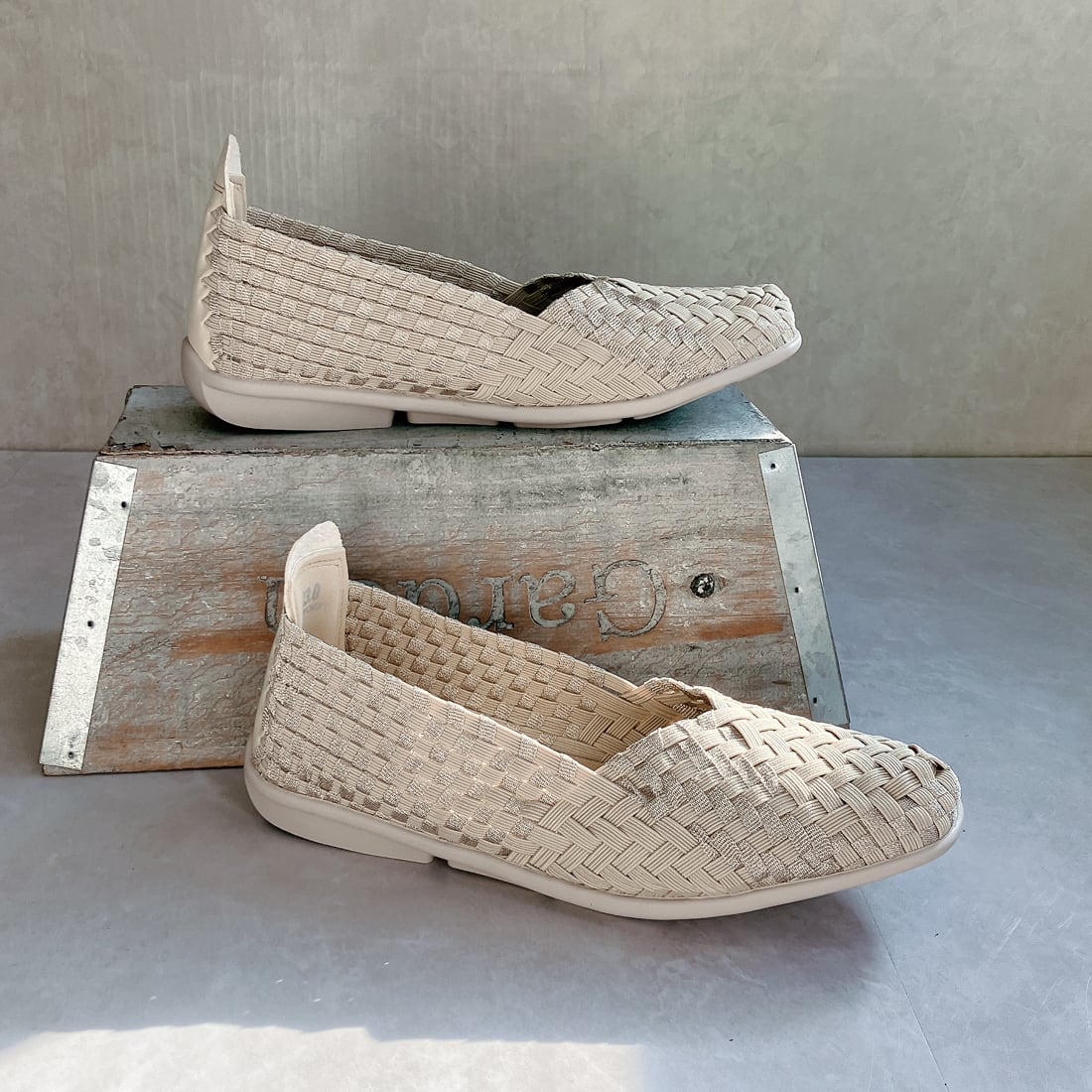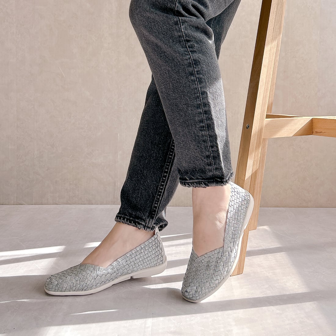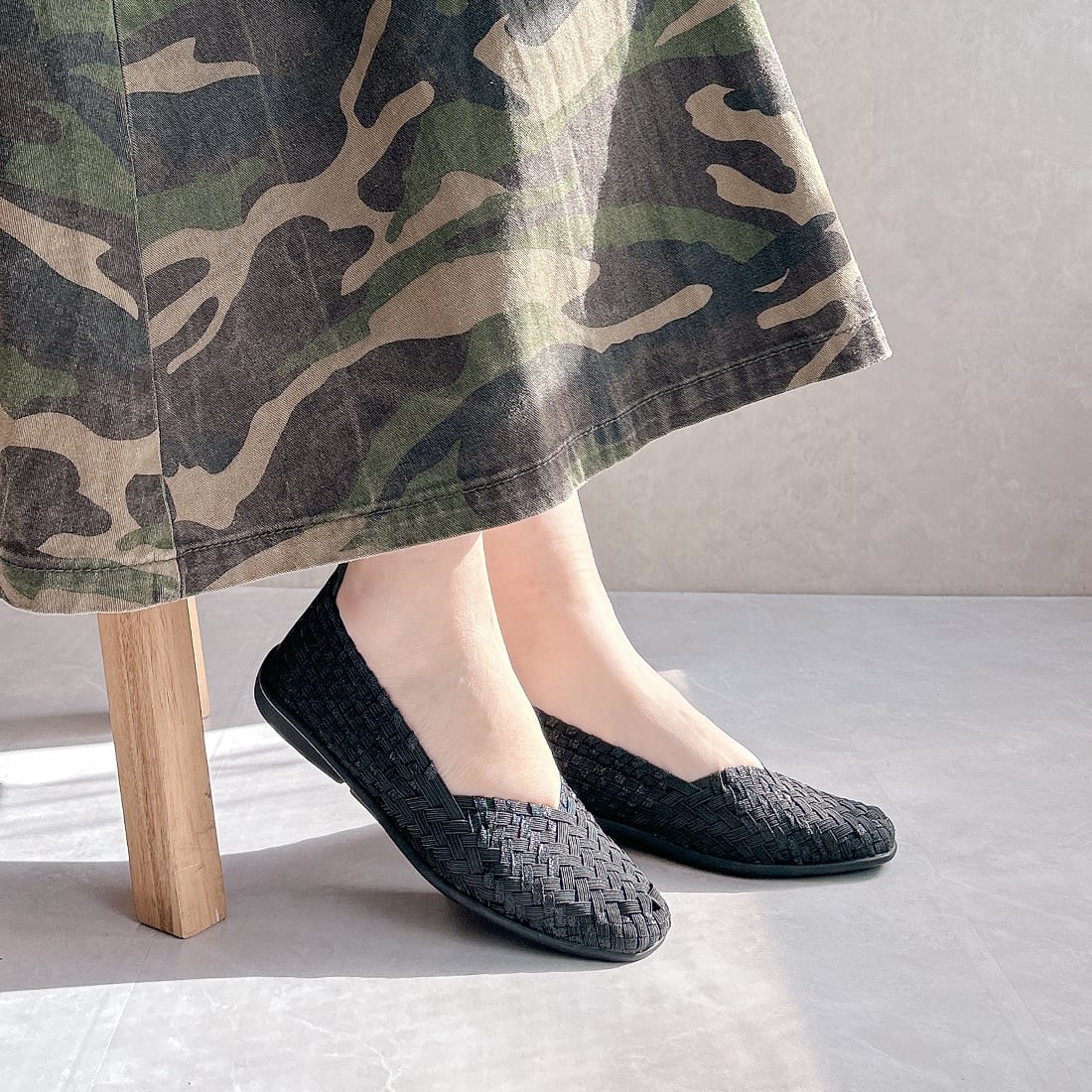 人気ブランド「ゴムゴム」の編み込みメッシュのやわらかバレエシューズ。
