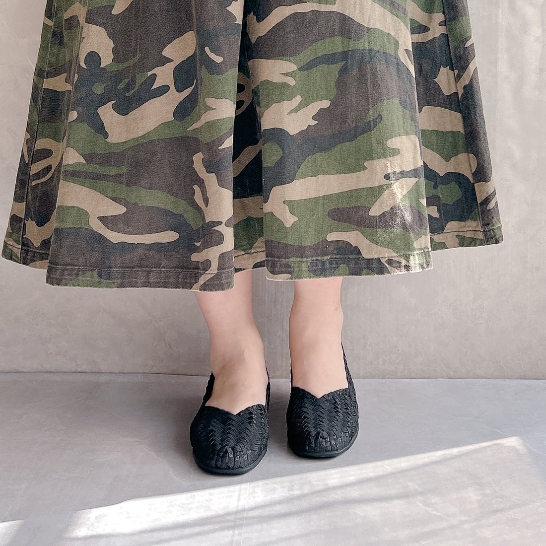 手編みならではの立体感のある編み込みデザインが、足元を軽やかで上品な印象に仕上げます。