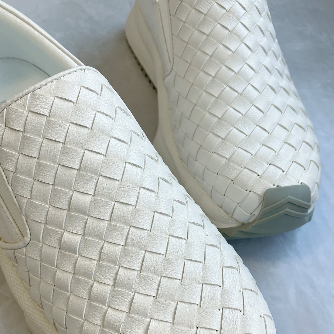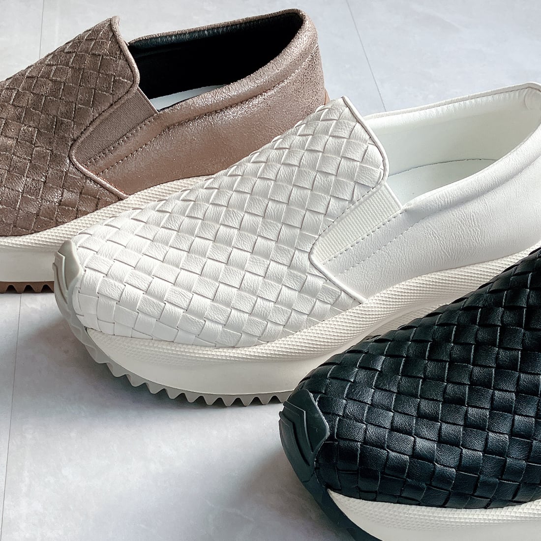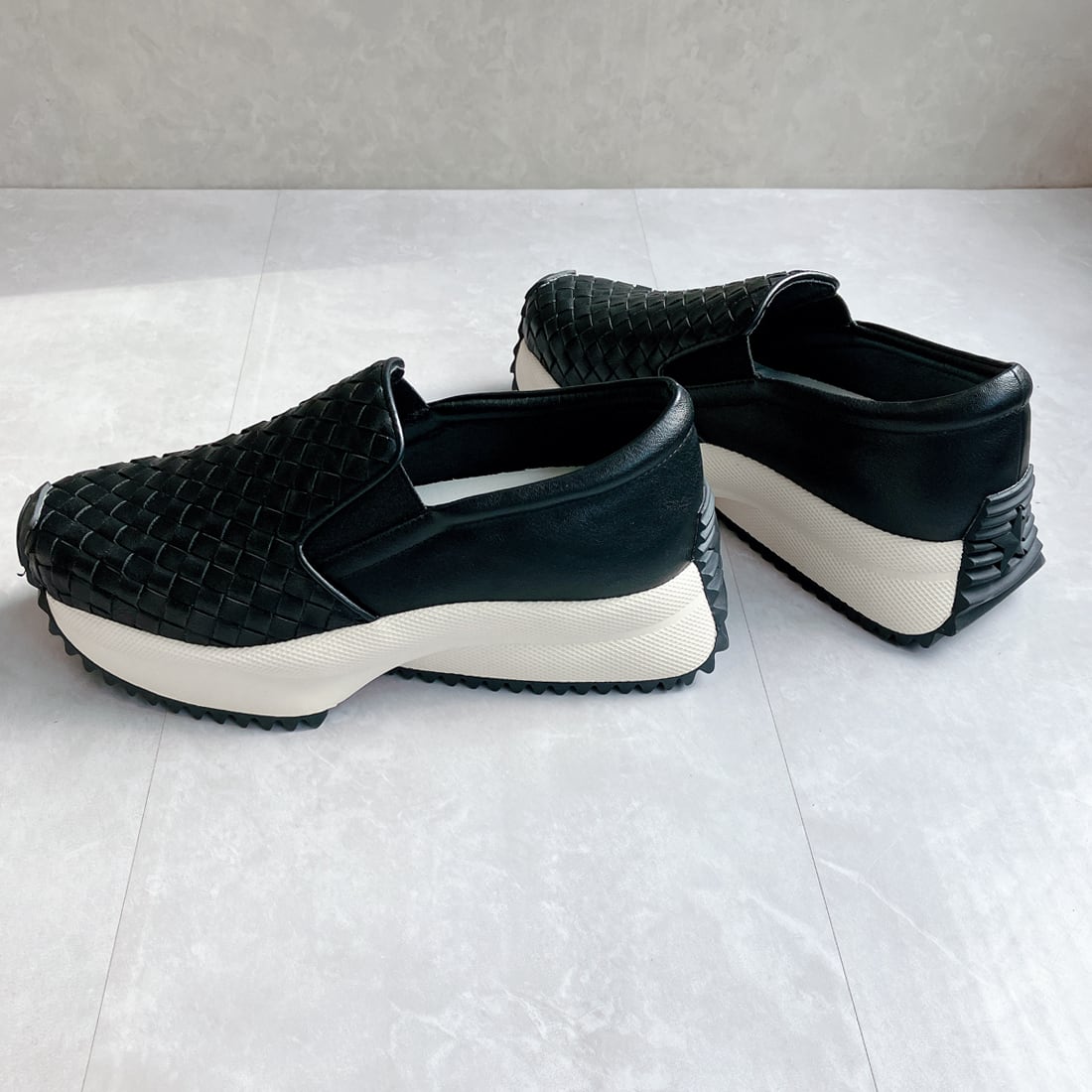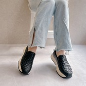 立体感のある編み込みデザインが、足元にさりげない高級感を演出するスリッポンシューズ。