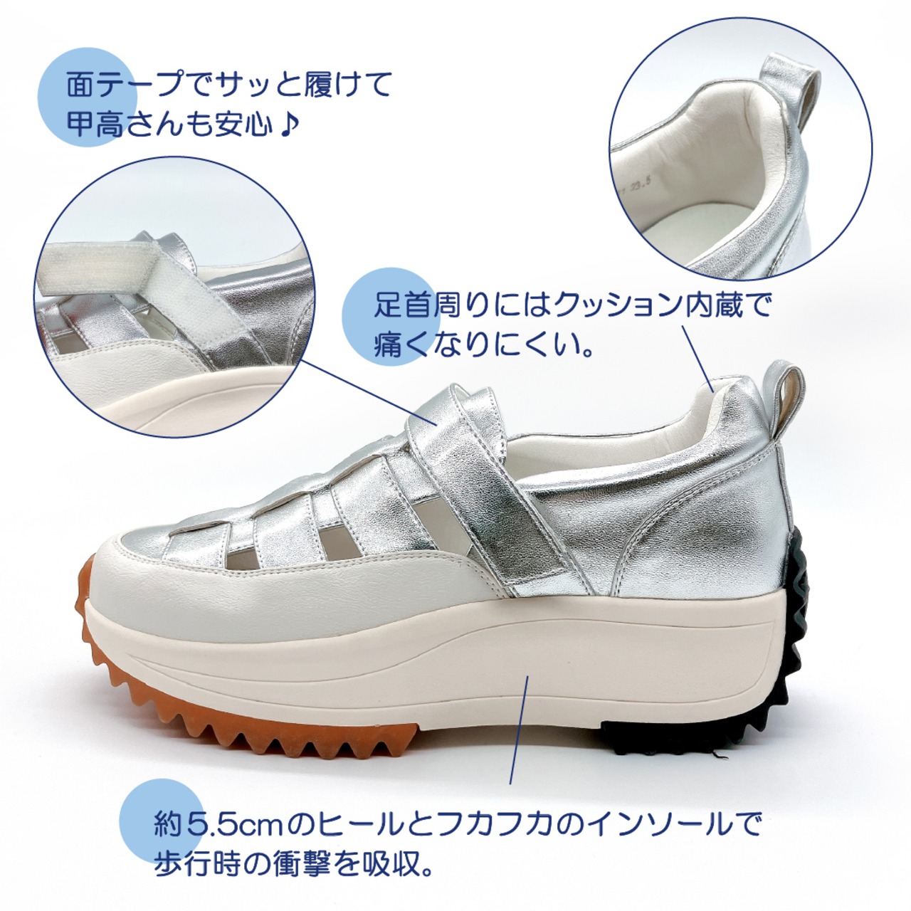 フカフカなインソールとクッション性の高い厚底ソールが歩行時の衝撃をやわらかく吸収。
