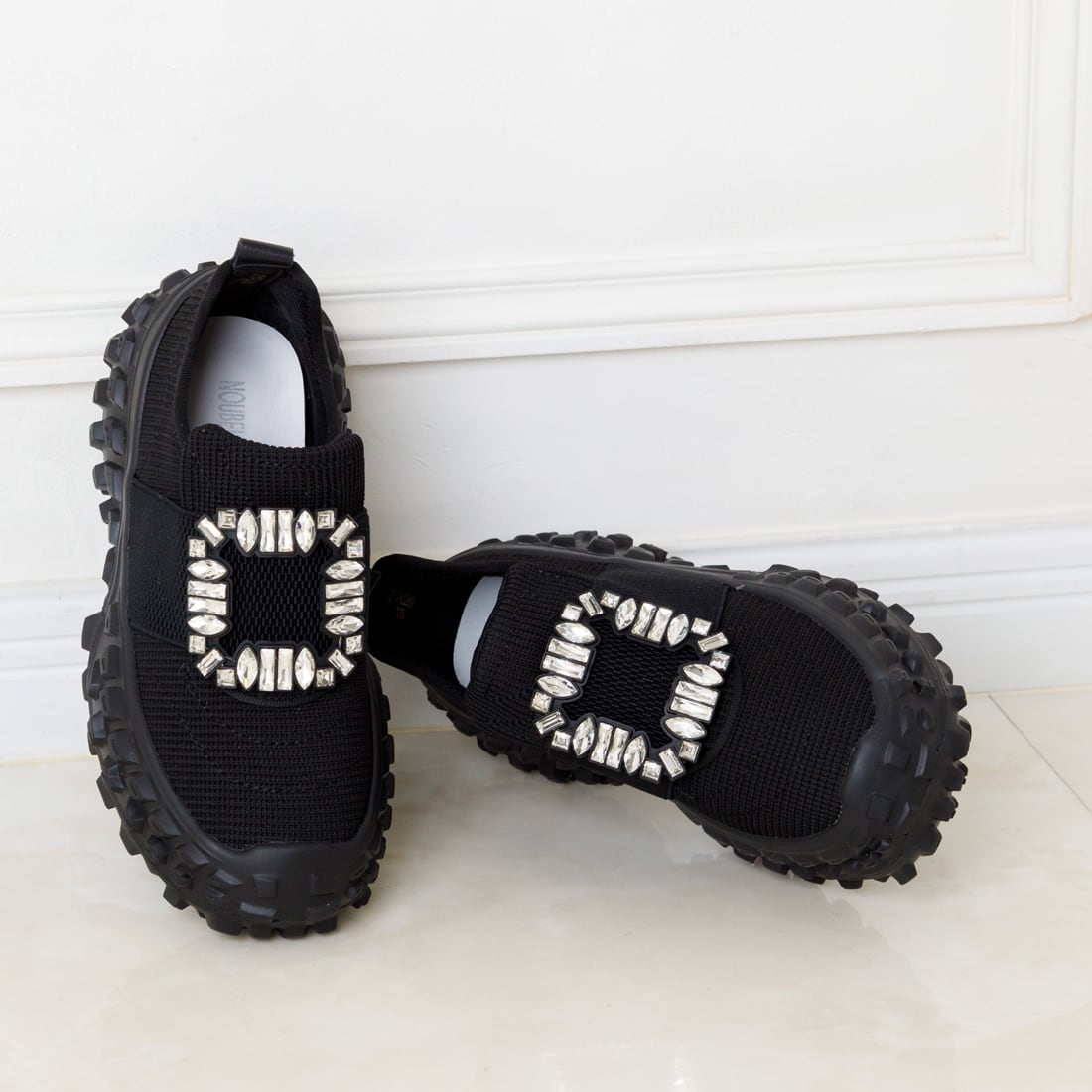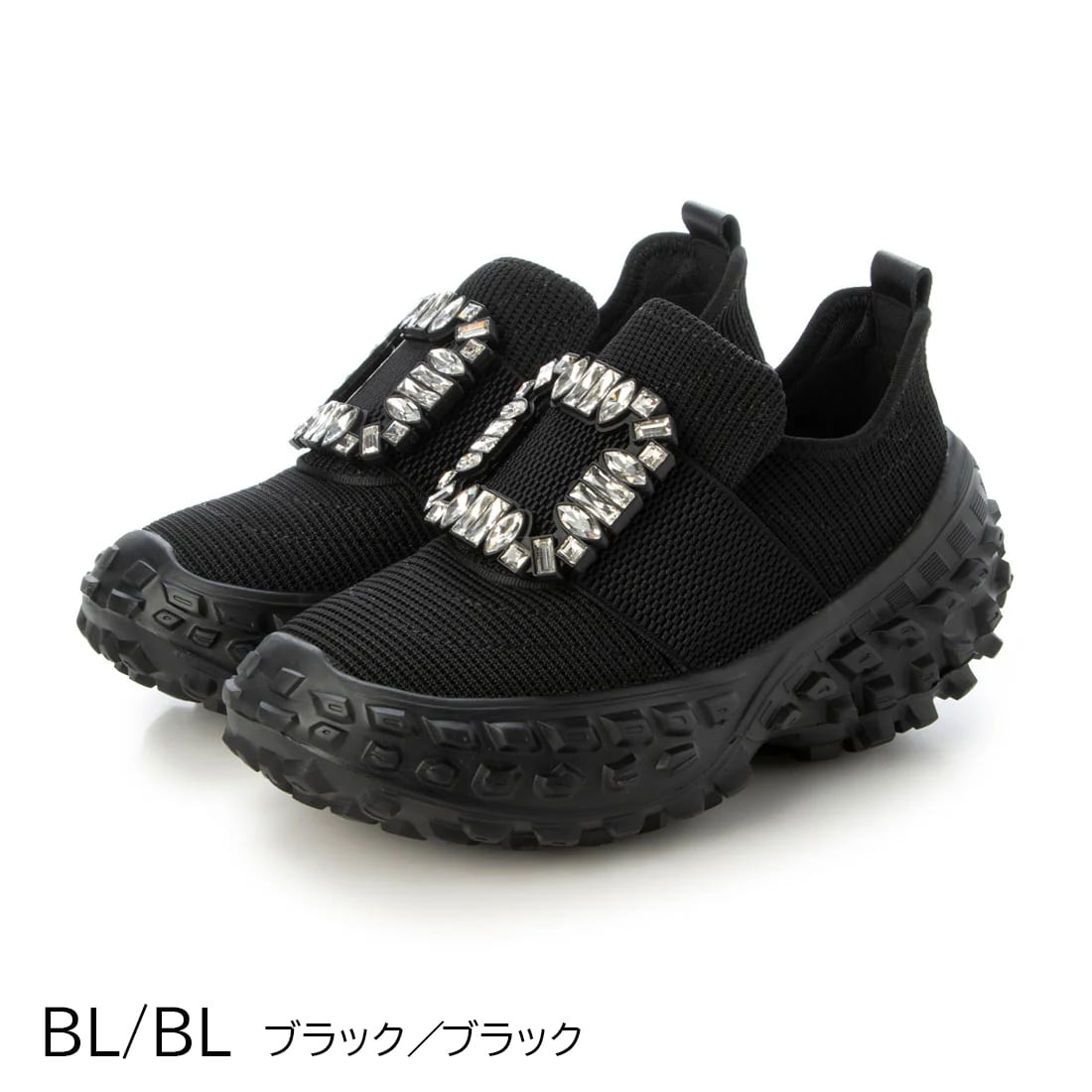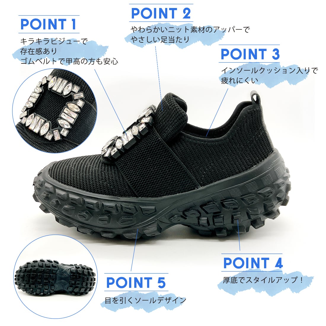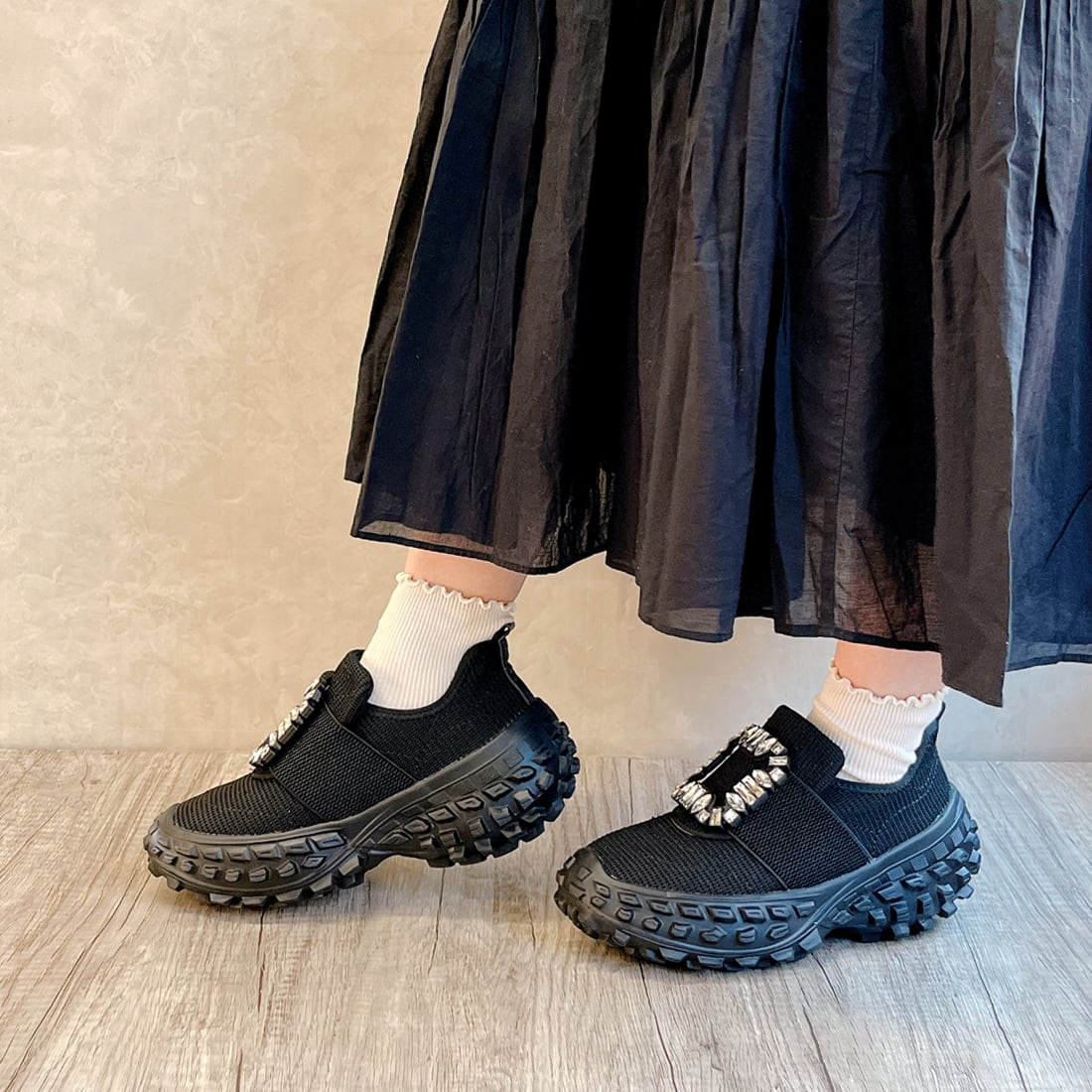 スリッポンタイプのニットスニーカー。バックルにちりばめられたビジューがキュートです!